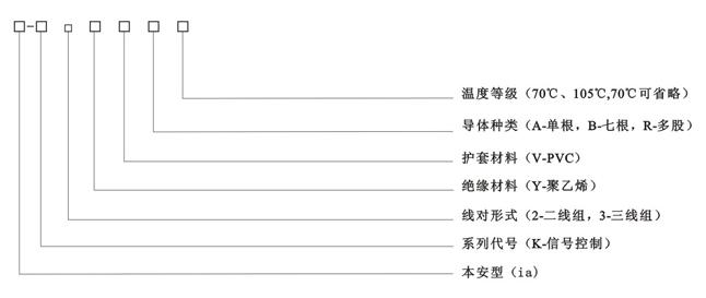 例:銅芯R類結(jié)構(gòu),聚乙烯絕緣,二線組,聚氯乙烯護(hù)套,有加分屏蔽和總屏蔽10對(duì)1.0mm2表示為:ia-K2YVPR10*2*1.0mm2