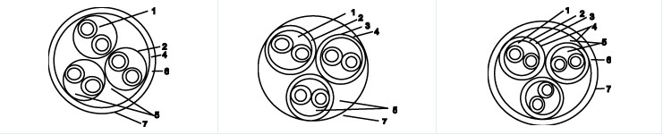 1、對絞線組 2、隔離層 3、對屏蔽 4、隔離層 5、填充 6、總屏蔽 7、隔離層外護(hù)套