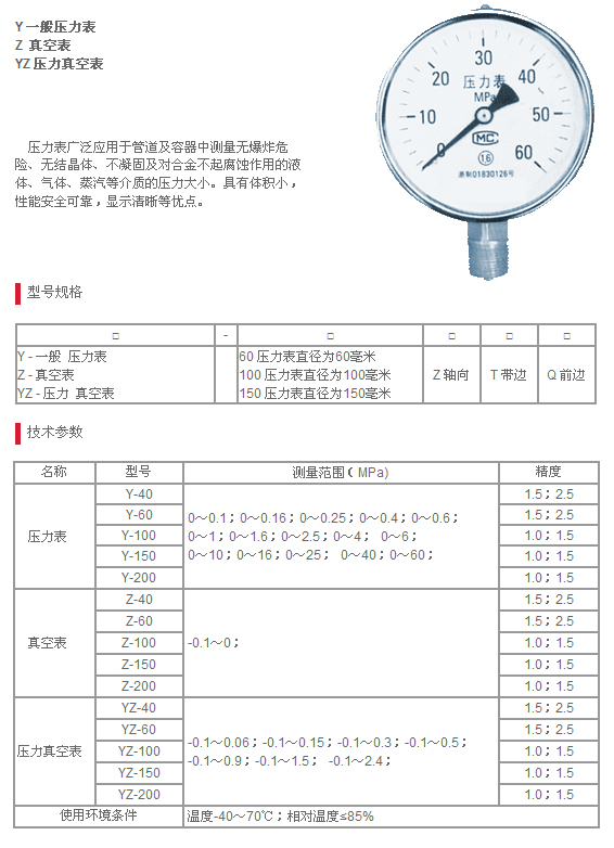 Z - 真空表 YZ - 壓力 真空表 |