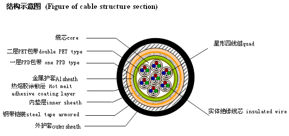 圖示為鐵路信號(hào)電纜結(jié)構(gòu)示意圖,其結(jié)構(gòu)與礦用信號(hào)電纜大同小異,與他一樣,礦用信號(hào)電纜的結(jié)構(gòu)大體也包含了這幾個(gè)部分。
